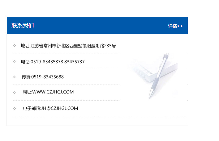 地址:常州市新北區友邦商務大廈1幢16、17層  電話:0519-85101652  傳真:0519-85112595  郵編:213022  網址:www.cz-jiayue_cn.lzspjx.com  郵箱:xiajifengaa@163.com